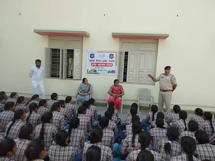 આજરોજ શ્રીમતી જે.એ.પટેલ મહિલા કોલેજ કેમ્પસ તેમજ એસ.વી.પી. કન્યા વિદ્યાલય મોરબી ખાતે મોરબી જિલ્લા ટ્રાફિક પોલીસ દ્વારા અકસ્માતનું પ્રમાણ ઘટે તે માટે જરૂરી ટ્રાફિક નું માર્ગદર્શન આપવામાં આવેલ અને ભારતને મળેલ G-20 ના અધ્યક્ષ પદ માટે જરૂરી માર્ગદર્શન આપવામાં આવ્યું