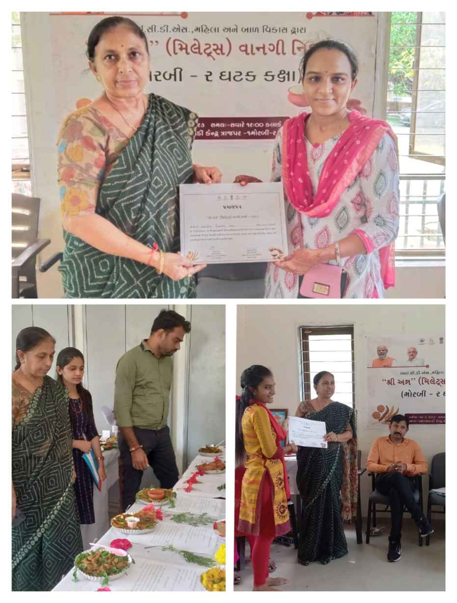 મિલીટ્સ વર્ષ ૨૦૨૩ ની ઉજવણી કરવામાં આવી રહી છે ત્યારે આઈસીડીએસ મોરબી ઘટક -૨નો ઘટક કક્ષાનો કાર્યક્રમ પોલીસ લાઇન આંગણવાડી કેન્દ્ર ખાતે સેજા કક્ષાએ વિજેતા થયેલ આંગણવાડી કેન્દ્રોના વર્કર બહેનો દ્વારા વાનગી સ્પર્ધા તેમજ વાનગી નિદર્શન યોજાયેલ.મોરબી ઘટક-૨ ના સેજા કક્ષાએ વાનગી હરીફાઈમાં વિજેતા થયેલ કુલ ૧૫ આંગણવાડી વર્કર બહેનોએ આ કાર્યક્રમમાં ભાગ લીધેલ હતો જેમાં નિર્ણાયકો દ્વારા પ્રથમ નંબર જીગ્નાબેન એમ.ઉપાધ્યાય બીજો નંબર નારણિયા તેજલબેન આર.ત્રીજો નંબર ત્રિવેદી દિવ્યાબેન સી. નો આવ્યો હતો વિજેતા થયેલા વર્કર બહેનોને પ્રમાણપત્રો આપીને સન્માનીત કર્યા હતા અને જિલ્લા કક્ષાએ ઉત્સાહ થી ભાગ લઈ વિજેતા થઈ આવવા આહવાન કરવામાં આવેલ.