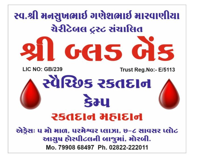 બેસણા દરમ્યાન શ્રી બ્લડ બેન્ક મોરબી દ્વારા સ્વૈરિછક રક્તદાન કેમ્પ નું આયોજન કરવામાં આવેલ છે રક્તદાન મહાદાન કેમ્પ નું આયોજન કરવા. આવ્યું છે