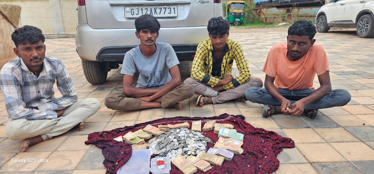 મોરબી એલસીબી પોલીસને ખાનગી રાહે બાતમી મળેલ કે હળવદના ચરાડવા ગામે મહાકાળી આશ્રમમાં રોકડ રકમ તથા દાગીનાની ચોરી કરનાર ચાર આરોપીઓ હળવદ ફુલ જોગણી મેલડી માતાજીના મંદિરની બાજુમાં આવેલ ક્રિષ્ના પાર્ક સામે ખરાબમાં આવેલ ઝુંપડામાં છે જેથી તપાસ કરતા ચારે આરોપી મહેશભાઇ રાજુભાઇ ધંધાણીયા રહે. રોનીગામ તળાવની બાજુમાં તા. શંખેશ્વર જી. પાટણ, પરબતભાઇ નાજાભાઇ સરૈયા રહે.કેદારીયા ગામ પાસે ધનાલા રેલ્વે સ્ટેશન પાસે ઝુપડામાં તા.હળવદ, પ્રતાપ ત્રિભોવનભાઇ ઉર્ફે તભાભાઈ ધનાભાઇ રહે.હાલ રાધનપુર રેલ્વે સ્ટેશન પાછળ,સુખપુરા રાધનપુર, ચેતનભાઇ ઉર્ફે ચેતલો પરબત ઉર્ફે પ્રભાત ઉર્ફે ચોટલો સમજુભાઇ જાગરીયા રહે. હાલ હળવદ ભવાની નગર ઢોરો, તથા કેદારીયા તા.હળવદ જી.મોરબી મુળ ગામ અલુદરા તાલુકો કડી જીલ્લો મહેસાણાવાળાને ઝડપી પાડી પુછપરછ કરતા ચારેય મળી હળવદ વિસ્તારમાં ચરાડવા નજીક આવેલ મહાકાળી આશ્રમ ખાતે તથા સુરેંદ્રનગર જિલ્લાના ધાંગધ્રા સીટીમાં નદીના કાંઠે આવેલ મસાણની મેલડી માતાજીના મંદીરમાં તથા વસ્તડી ખાતે આવેલ સામાકાંઠા વાળા મેલડી માતાજીના મંદીરમાં આશરે દશેક દિવસના સમય ગાળામાં રાત્રીના સમયે અલગ-અલગ વાહનોમાં જઇ મંદીરમાં પ્રવેશી મંદીરમાં રહેલ દાન પેટીમાંથી રોકડા રૂપીયા તથા માતાજીને ચડાવેલ સોના તથા ધાતુના દાગીનાઓની ચોરી કરેલ હોવાની કબૂલાત કરતા ચારે આરોપીઓ પાસેથી રોકડ રકમ તથા સોના તેમજ ધાતુના દાગીના સહીત કુલ કિ.રૂ. ૨,૯૧,૦૦૫/- ના મુદામાલ કબ્જે કરી ચારે આરોપીઓને આગળની કાર્યવાહી અર્થે હળવદ પોલીસ સ્ટેશન ખાતે સોપી આપેલ છે.