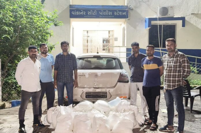 વાંકાનેર સીટી પો.સ્ટેના સર્વેલન્સ સ્ટાફના કામગીરી કરવા પ્રત્યનશીલ હોય તે દરમ્યાન મળેલ હકીકતના આધારે કે એક સફેદ કલરની સ્વિફટ ગાડી વાંકાનેર બાઉન્ટ્રી તરફથી મોરબી તરફ જનાર છે.જે હકિકત આધારે પોલીસ સ્ટાફના માણસો ને.હા કેરાળા ગામના બોર્ડ પાસે વોચ તપાસમા હોઇ જે હકિકત વાળી ગાડી આવતા રોકવાનો પ્રયત્ન કરતા ગાડી ચાલકે ગાડી ભાગાડી મુકેલ જે ગાડીનો પીછો કરી આસીયાના સોસાયટી પાછળ મહાદેવ મંદિર સામે નદીના વોહકરામાથી દેશીદારૂ લીટર-૫૫૦ કિ.રૂ-૧,૧૦,૦૦૦/- સાથે કુલ મુદામાલ કી.રૂ- ૬,૧૦,૦૦૦/-નો મુદામાલ પકડી પાડી વાંકાનેર સીટી પોલીસ સ્ટેશનમાં પ્રોહીધારા હેઠળ ગુનો રજીસ્ટર કરી કાયદેસરની કાર્યવાહી કરવામા આવેલ છે.