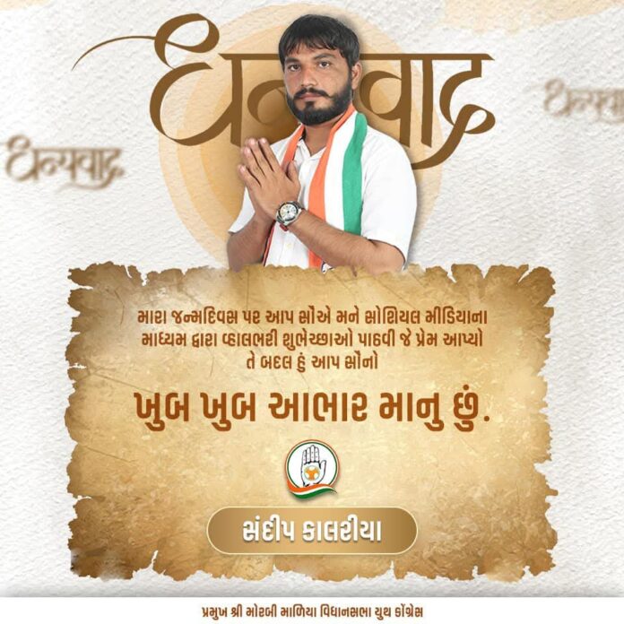 માળિયા મી. ના રોહિશાળા ગામના વતની અને મોરબી કોંગ્રેસ તાલુકા પ્રમુખ જીલ્લા કોંગ્રેસના યુવા આગેવાન સંદીપ કાલરીયા નો આજે જન્મ દિવસ છે ત્યારે તેમના જન્મદિવસ નિમિતે સગા સ્નેહીજનો, પરિવારજનો, મિત્રમંડળ તરફથી તેમજ સોશ્યલ મીડિયા ના માધ્યમ થી સંદીપ ભાઈ ના મો. 78610 87267 પર સુભકામના નો ધોધ વર્ષી રહ્યો છે. મોરબી ગૌરવ સમાચાર તરફથી સંદીપભાઈ ને જન્મ દિવસ ની ખૂબ ખૂબ શુભકામના