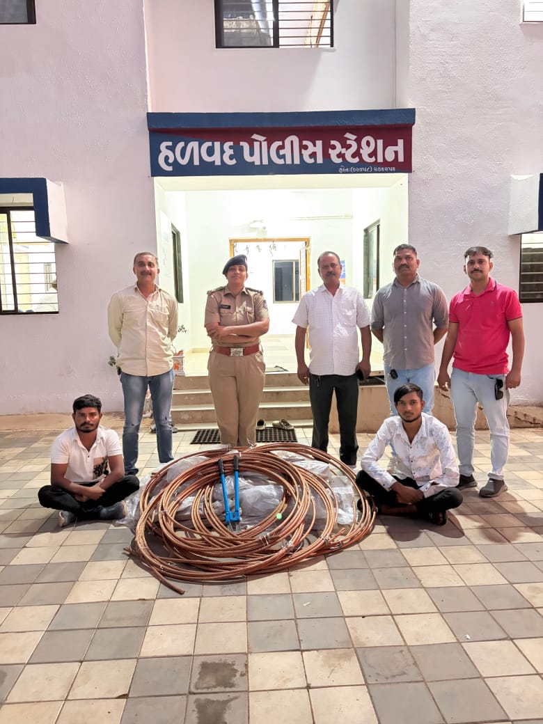 હળવદ પો.સ્ટે.ના પોલીસ ઇન્સપેક્ટર આર.ટી.વ્યાસ ની સુચનાથી સર્વેલન્સ સ્ટાફના માણસો અનડિટેકટ ગુનાઓ ડિટેકટ કરવા પ્રયત્નશીલ હોય તે દરમ્યાન મળેલ બાતમીના આધારે સુખપર ગામની સીમમાંથી બે ઇસમોને હળવદ પોલીસ સ્ટેશન વિસ્તારમાં કવાડીયા ગામની સીમમાં સોલાર પ્લાન્ટમાં ચોરીમાં ગયેલ ઇલેકટ્રીક કોપર કેબલ વાયરનુ કોપર ૪૬૦ કિલો ૭૦૦ ગ્રામ જેની કિ.રૂ ૨,૯૯.૪૫૫/- ના મુદામાલ સાથે પકડી આરોપીઓ વિરુધ્ધ કાયદેસરની કાર્યવાહી કરવામાં આવેલ છે.