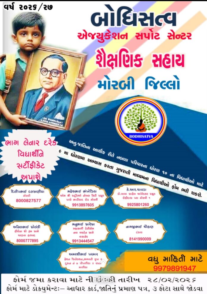 મોરબી: બોધિસત્વ ટ્રસ્ટ જામનગર દ્વારા જામનગર દેવ ભૂમિ દ્વારકા અને મોરબી જિલ્લા ખાતે વિવિધ શૈક્ષણિક પ્રવૃત્તિઓ કરવામાં આવે છે. જેમાં લાઇબ્રેરી, કોમ્પ્યુટર ક્લાસ, મેડિકલ સહાય, સ્પર્ધાત્મક પરીક્ષાના ફ્રી વર્ગો, શૈક્ષણિક સહાય જેવી પ્રવૃત્તિઓ કરવામાં આવે છે. જેના અનુસંધાને હાલ સંસ્થા દ્વારા મોરબી, જામનગર અને દેવભૂમિ દ્વારકાનાં ધોરણ 10માં અભ્યાસ કરતા વિદ્યાર્થીઓને શૈક્ષણિક સહયોગ આપવાનું નક્કી કરેલ છે જેમની પરીક્ષા માટેનાં ફોર્મ મોરબી ખાતેથી મળી રહેશે. જેમાં હાલ 9માં ધોરણમાં અભ્યાસ કરતા ગુજરાતી માધ્યમનાં અનુ.જાતિ સમાજના મોરબી અને અન્ય બે જિલ્લાઓના વિદ્યાર્થીઓ તારીખ 28/02/2025 સુધી વિનામૂલ્યે ફોર્મ મેળવી જમાં કરાવી આપવાના રહેશે.