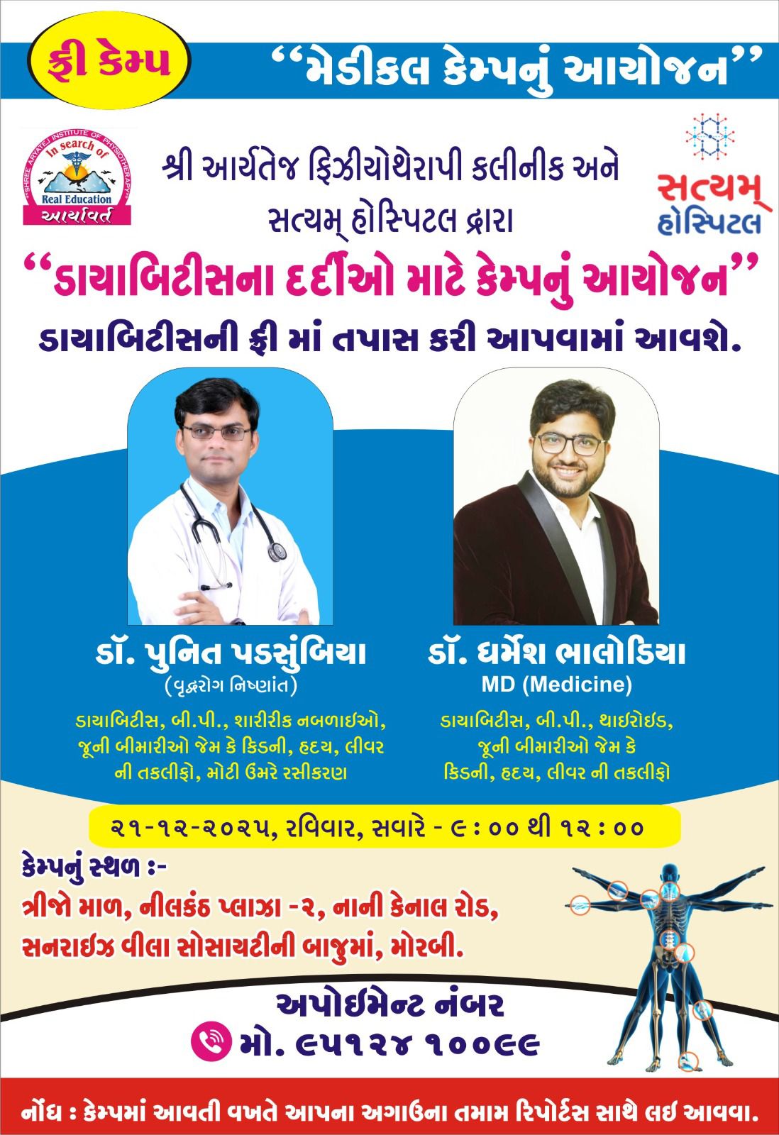 મોરબી શહેરમાં ડાયાબિટીસના દર્દીઓ માટે નિઃશુલ્ક મેડિકલ કેમ્પનું આયોજન કરવામાં આવ્યું છે. શ્રી આર્યતેજ ફિઝીયોથેરાપી ક્લિનિક અને સત્યમ હોસ્પિટલના સંયુક્ત આયોજન હેઠળ આ કેમ્પ રવિવાર તારીખ ૨૧-૧૨-૨૦૨૫ના રોજ સવારે ૮:૦૦ થી બપોરે ૧૨:૦૦ વાગ્યા સુધી ત્રીજો માળ, નીલકંઠ પ્લાઝા–૨, નાની કેનાલ રોડ, સનરાઇઝ વિલા સોસાયટીની બાજુમાં, મોરબી ખાતે યોજાશે. કેમ્પ દરમિયાન ડાયાબિટીસ તેમજ તેની સાથે જોડાયેલી બી.પી., કિડની, હૃદય, લીવર અને નસોની તકલીફ અંગે નિષ્ણાત તબીબો દ્વારા નિઃશુલ્ક તપાસ અને માર્ગદર્શન આપવામાં આવશે. આ કેમ્પમાં ડૉ. પુનિત પડ્સુંબીયા (મોટી ઉમરે થતા રોગના નિષ્ણાત) અને ડૉ. ધર્મેશ ભાલોડિયા (MD – Medicine) દ્વારા દર્દીઓની તપાસ કરવામાં આવશે. કેમ્પમાં આવનારા દર્દીઓને પોતાની અગાઉની મેડિકલ રિપોર્ટ્સ સાથે લાવવાની વિનંતી કરવામાં આવી છે. કેમ્પ માટે પૂર્વ અપોઇન્ટમેન્ટ ફરજિયાત રહેશે. અપોઇન્ટમેન્ટ માટે મો. ૯૫૧૨૪ ૧૦૦૫૫ પર સંપર્ક કરી શકાય છે.