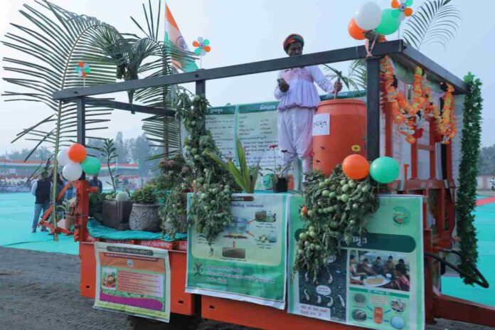 ખેતીવાડી વિભાગના ટેબ્લોમાં રાસાયણિક ખેતીના વિકલ્પ રૂપે પ્રાકૃતિક ખેતી (Natural Farming) અપનાવવા પર વિશેષ ભાર મૂકવામાં આવ્યો હતો. પૃથ્વીના સ્વાસ્થ્ય અને મનુષ્યના આરોગ્ય માટે પ્રાકૃતિક ખેતી કેટલી અનિવાર્ય છે, તે ટેબ્લો દ્વારા સચોટ રીતે સમજાવવામાં આવ્યું હતું. આ પ્રદર્શનમાં પ્રાકૃતિક ખેતીના પાયા સમાન ‘જીવામૃત’ બનાવવાના ઘટકો અને તેની પ્રક્રિયાનું જીવંત નિદર્શન કરવામાં આવ્યું હતું. ઉપસ્થિત ખેડૂતોને સમજાવવામાં આવ્યું હતું કે કેવી રીતે ગાયના છાણ અને ગૌમૂત્ર દ્વારા જમીનની ફળદ્રુપતા વધારી શકાય છે અને ખેતીના ખર્ચમાં ઘટાડો કરી શકાય છે.