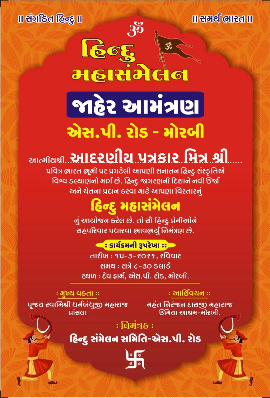 મોરબી શહેરમાં હિંદુ સમાજમાં એકતા, સંસ્કૃતિ અને જાગૃતિ વધે તે હેતુથી હિંદુ મહાસંમેલનનું ભવ્ય આયોજન કરવામાં આવ્યું છે. આ કાર્યક્રમ તા. 15 માર્ચ 2025, રવિવારના રોજ રાત્રે 8:30 વાગ્યે દેવ ફાર્મ, એસ.પી. રોડ, મોરબી ખાતે યોજાનાર છે.