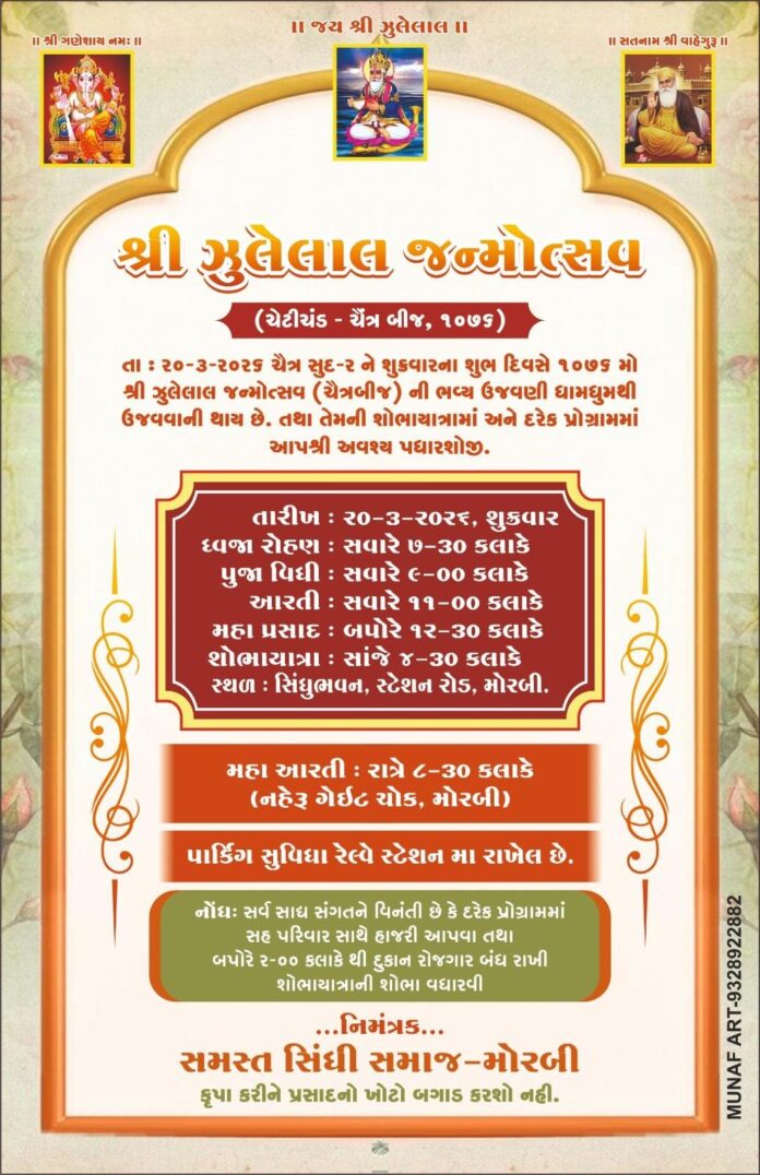 મોરબી સિંધી સમાજ દ્વારા તા. ૨૦ માર્ચ ચૈત્ર સુદ ૨ ને શુક્રવારના શુભ દિવસે ૧૦૭૬ મો શ્રી ઝૂલેલાલ જન્મોત્સવની ભવ્ય ઉજવણી કરવામાં આવશે