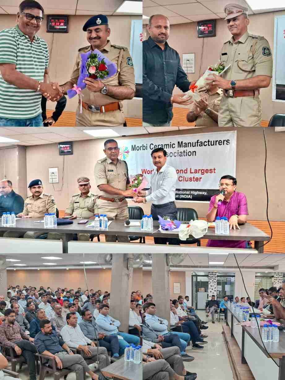 મોરબી ખાતે સિરામિક એસોસિએશન હોલમાં ઉદ્યોગકારો અને પોલીસ અધિકારીઓ વચ્ચે મહત્વપૂર્ણ બેઠક યોજાઈ હતી. આ બેઠકમાં મોરબીના પોલીસ એસપી મુકેશ પટેલ, ડીવાયએસપી સમીર સારડા, જે એમ આલ સહિત અન્ય અધિકારીઓ ઉપસ્થિત રહ્યા હતા.